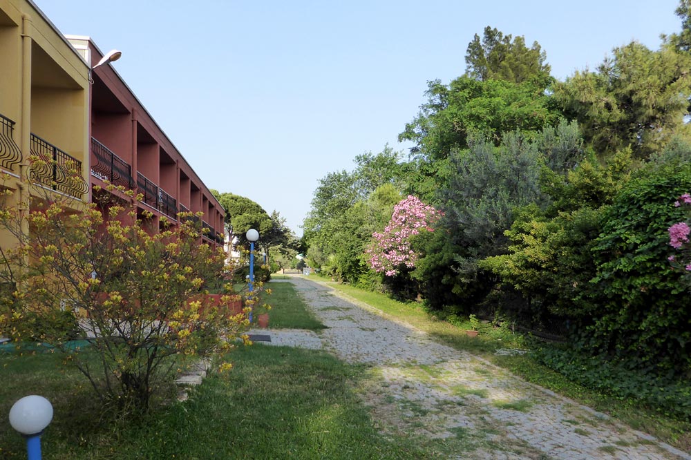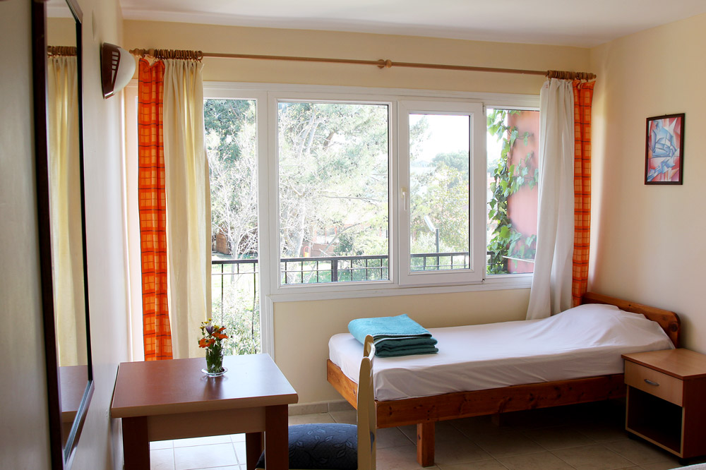Unsere Gäste wohnen in drei zweistöckigen Gebäuden, die das große Parkgelände im Norden und Osten begrenzen, überwiegend in einfach ausgestatteten Dreibettzimmern. Alle 26 Zimmer haben Balkon mit Blick aufs Meer, Dusche und WC. Warmes Wasser wird mit Sonnenenergie bereitet. Pro Haus gibt es ein rollstuhlgerechtes Zimmer.