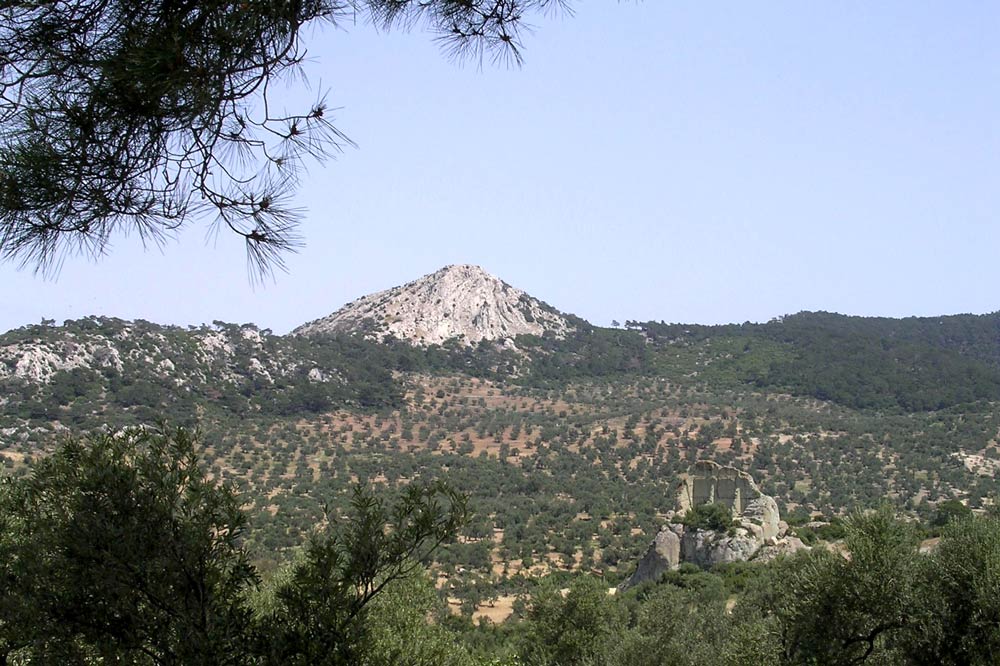 Defne ağaçları üzerinden Sakar Dağı’nın zirvesi